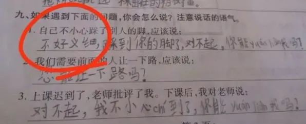 下面这位小朋友也是同样的情况,ta把“不好意思”写成“不好义细”,虽然看起来很搞笑,但这也恰恰说明了孩子无法很好地区分书面语和口头语,导致孩子出现“乱用词”的现象。