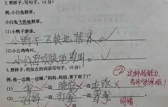比如下面这位小朋友,虽然ta的造句让人捧腹大笑,但不难看出,孩子对“一边……一边……”这种结构的句子并没有理解透彻。