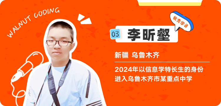 在新疆乌鲁木齐,有一个腼腆却又健谈的男孩——李昕壑。经历了核桃完整的编程学习体系后,他在2024年CSP-J比赛中获得二等奖,并以信息学特长生的身份进入乌鲁木齐市某重点中学。