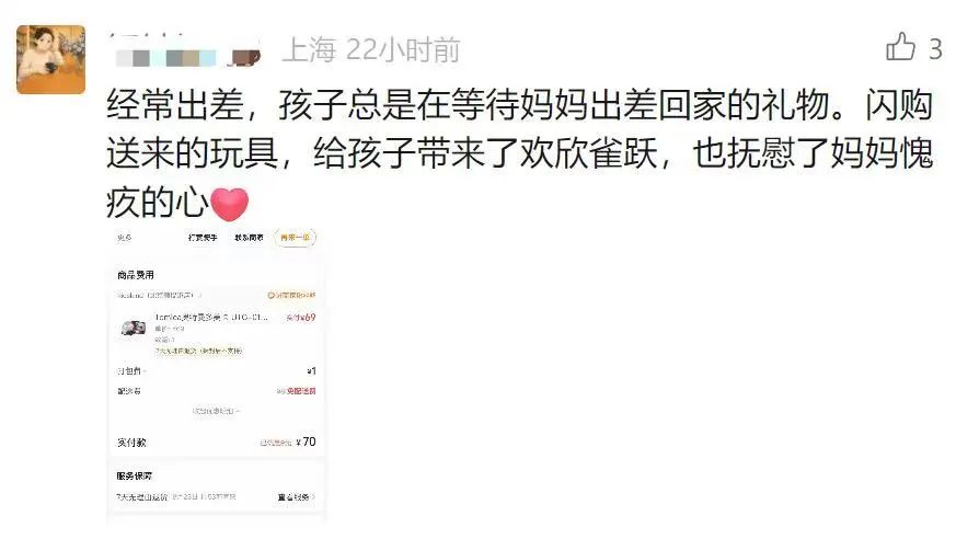 这位经常出差的妈妈,用闪购的玩具,给孩子带来了欢乐,也抚平了她愧疚的心。