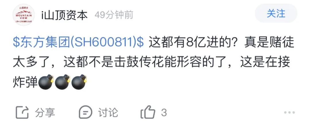 雪球App@ i山顶资本 表示:这都有8亿进的?真是赌徒太多了,这都不是击鼓传花能形容的了,这是在接炸弹。
