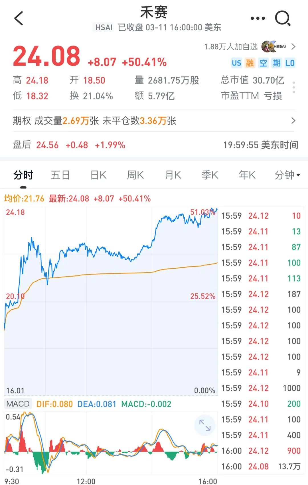 值得关注的是中概股:禾赛科技暴涨涨50.04%。