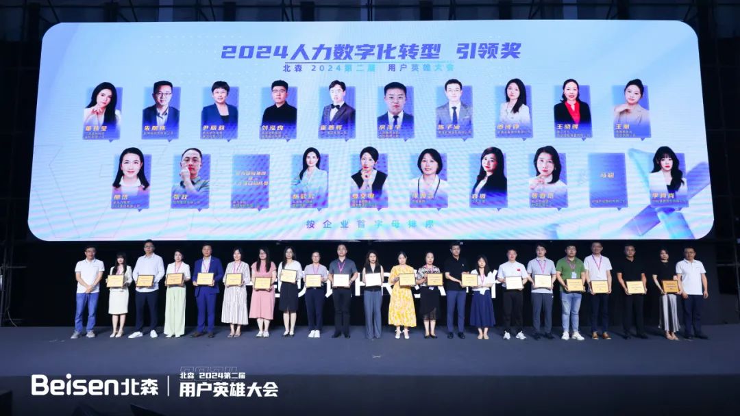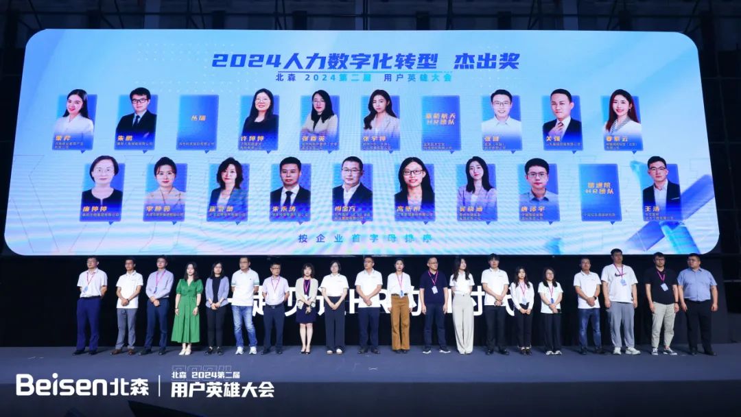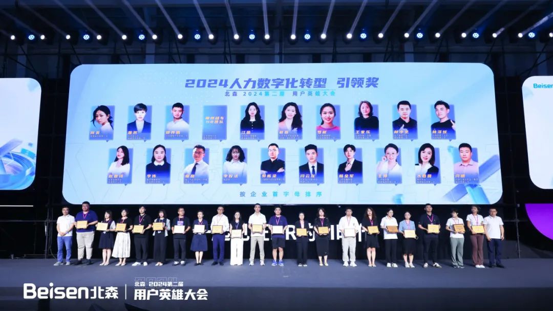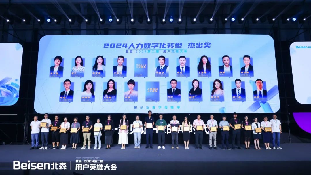据悉,目前北森客户中有10%以上涉及出海场景需求,很多场景应用已经开通。比如小语种开通的企业客户已经超过600家。去年首届HRIS用户英雄大会开始,纪伟国就明确表示,HRIS(人力资源管理者)们将业务语言转化为数字化语言,并突破业务层层障碍,是企业人力资源数字化真正的幕后英雄,也是北森人力资源数字化落地的关键角色。“我们将通过实际行动,不遗余力且坚定地支持、赋能、陪伴HRIS用户的成长。”今年这一主张得以延续。综合2023年HRIS用户/团队的成长、业务赋能、数字化创新等多个维度,本届用户英雄大会评选出2024人力资源数字化转型引领奖、2024人力资源数字化转型杰出奖两项大奖,截止目前共有82位HRIS用户英雄获奖。大会现场颁奖环节,用户英雄们迎来自己的闪耀时刻。