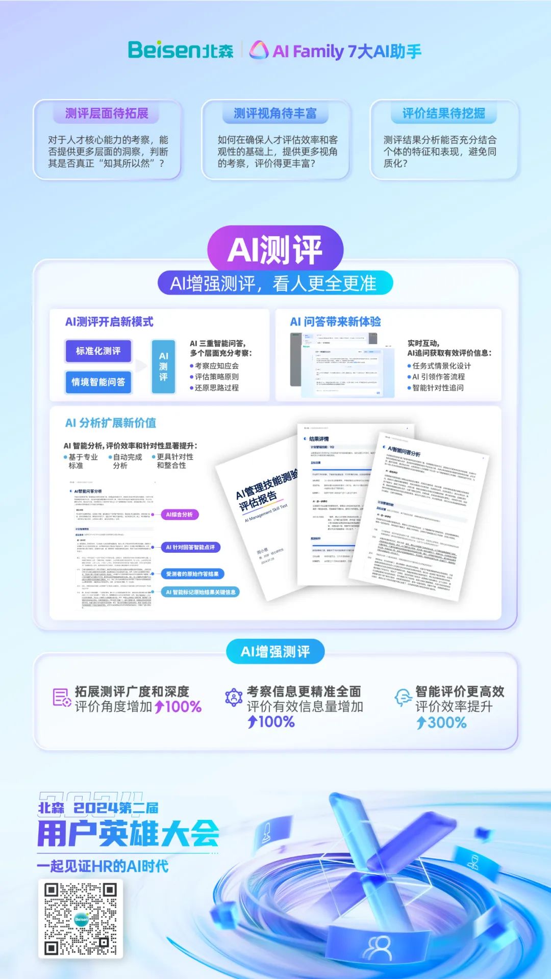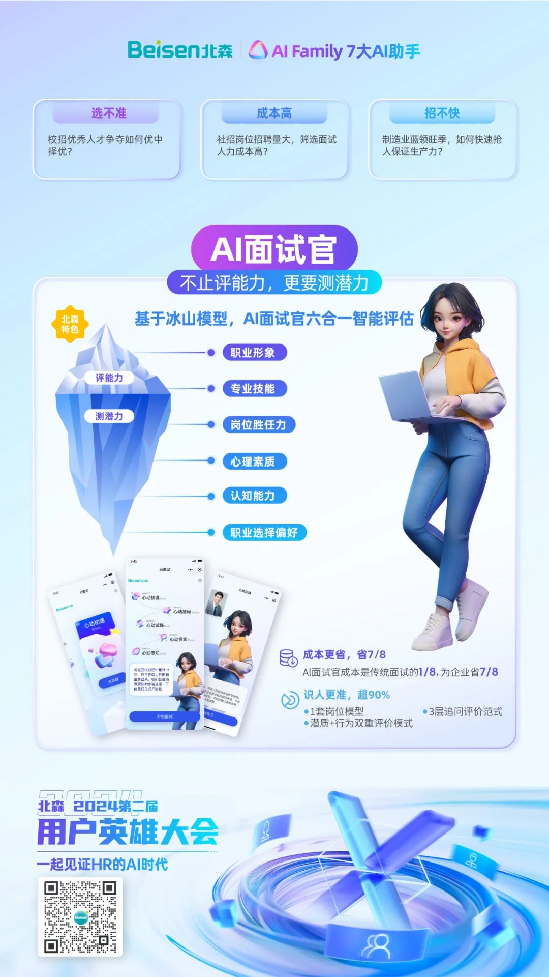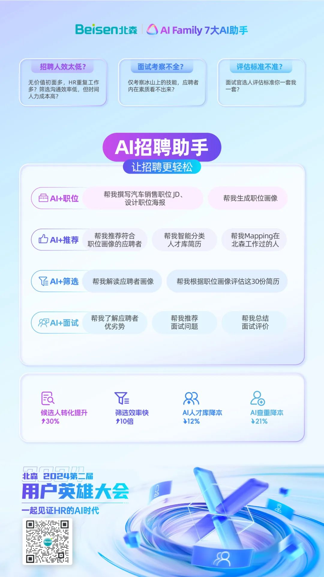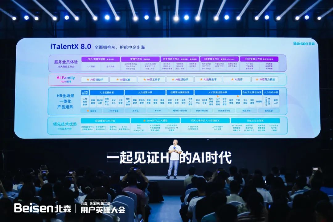 8月15日,北森“2024第二届用户英雄大会”在京举办。大会聚焦“一起见证HR的AI时代”,以一大主论坛+七大分论坛的形式,设置了一体化HRSaaS、AI招聘运营、AI重塑学习、人才管理&干部数字化、低代码平台与AI技术、全面绩效管理和HR数字化私董会等不同议程,并邀请了30余位在国内、外有影响力的组织与人力资源数字化专家、HR数字化实践者、AI技术大牛等嘉宾亲临现场分享前沿洞察与实践案例。期间,北森重磅发布iTalentX 8.0,通过AI大模型的HR七大AI助手+全球一体化HR SaaS解决方案,全面赋能企业通往HR数字化新时代。