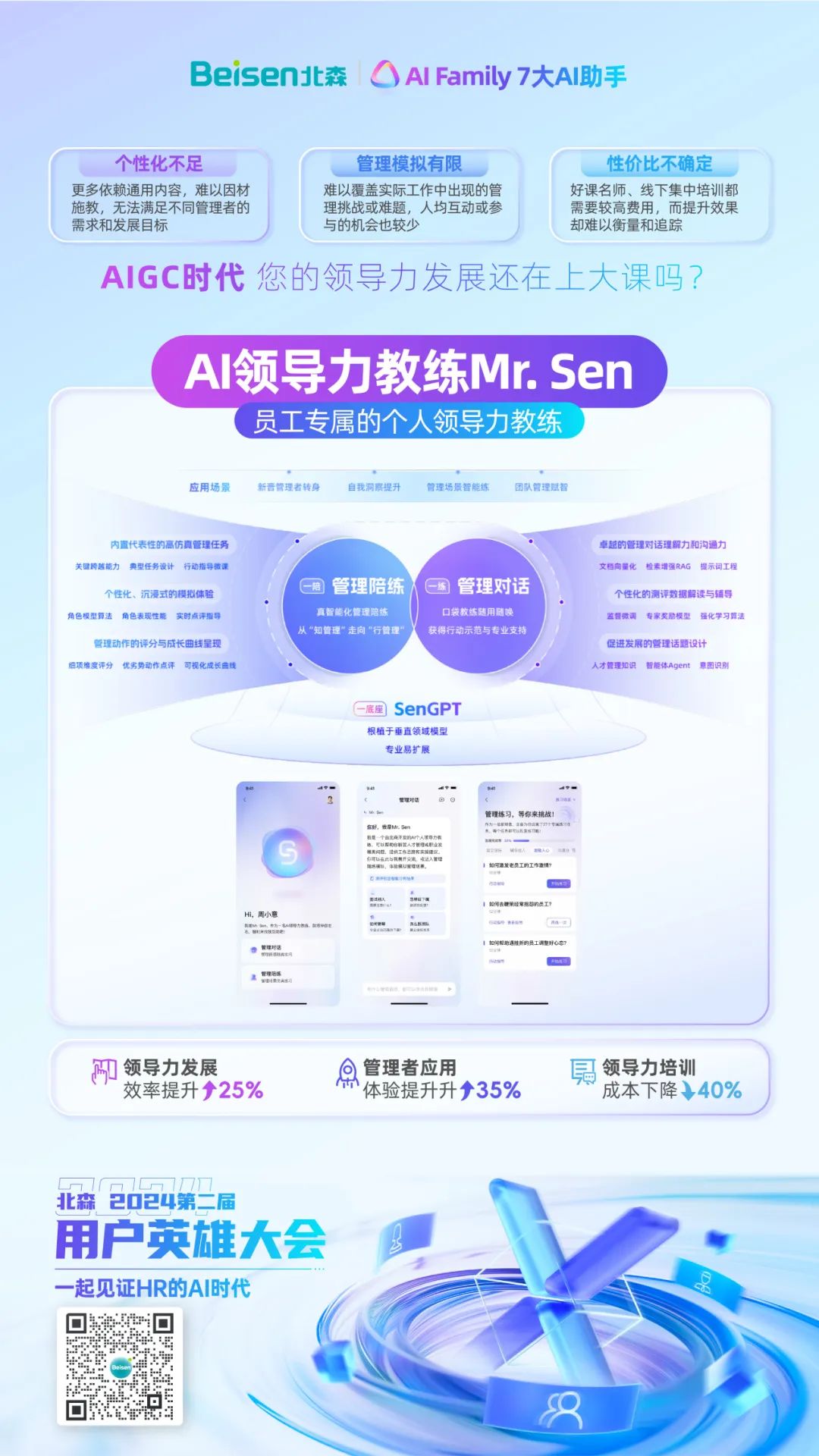 还有AI测评在测评体验、测评深度和测评个性化三大方面的增强,让企业看人更全面更准确。以及AI领导力教练Mr.Sen,打造员工专属的个人领导力教练,让领导力训练可以因材施教、增加真实互动与体验感,同时成本与回报更直观。