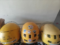 (史同彬戴过的三个旧头盔仍留在家中作为纪念)