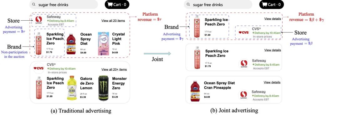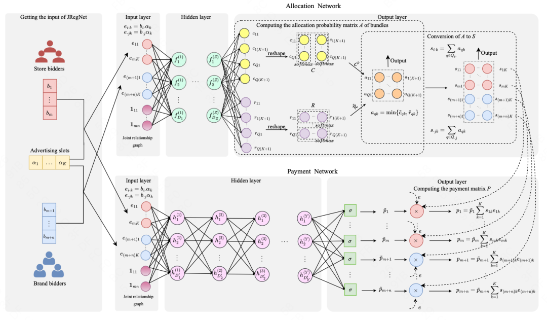论文简介:在线广告是电子商务平台的主要收入来源。在当前的广告模式中,定向目标是愿意支付额外费用以提升其店铺位置的在线店铺主。另一方面,品牌供应商也希望在店铺中宣传其产品以提升品牌销量。然而,目前使用的广告模式无法同时满足店铺和品牌供应商的需求。为了解决这个问题,我们创新性地提出了一个名为「联合拍卖」的联合广告模型,允许品牌供应商和店铺共同竞标广告位,满足双方的需求。然而,传统的广告拍卖机制不适合这一新颖场景。在本论文中,我们提出了一种名为 JRegNet 的神经网络架构,用于最优联合拍卖设计,以生成满足近似DSIC和IR的近似最优机制。最后,我们在模拟数据和真实数据上进行了多项实验,证明与已知基线相比,我们提出的联合拍卖模型取得了较好的成果。03