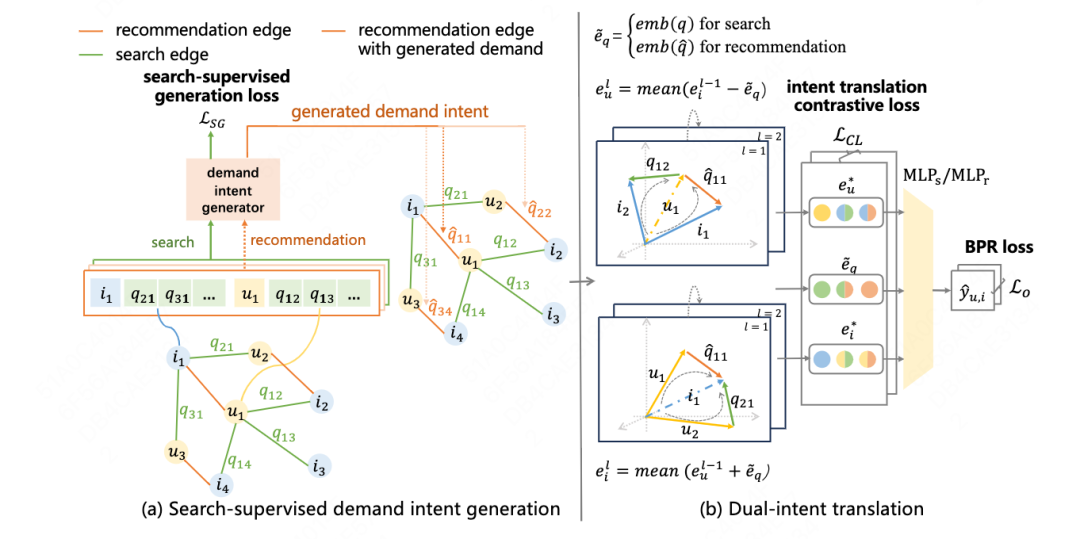 论文简介:推荐系统旨在帮助用户在众多候选商品中发现他们所喜爱的商品,并已服务于各种在线平台的数十亿用户。从直观上看,用户与商品的交互高度受到他们稳定的固有意图(例如,始终偏好高质量的商品)和变化的需求意图(例如,夏天想要一件T恤,冬天想要一件羽绒服)的驱动。然而,这两种意图在推荐场景中都是隐式表达的,这给准确感知用户意图带来了挑战。幸运的是,在通常与推荐系统共存于同一在线平台的搜索场景中,用户通过查询词显式表达了他们的需求意图。直观上,在这两种场景中,同一用户的交互可能受到相似的需求意图的影响,并且其固有意图是稳定的。因此,利用这两个场景中的交互数据来相互增强或补充双重意图,并进行联合意图感知建模是可行的。然而,搜索和推荐的联合意图感知建模需要解决以下两个问题:(1)准确建模推荐中用户隐式的需求意图;(2)建模双重意图与交互商品之间的关系。为了解决上述问题,我们提出了基于双重意图转换的搜索推荐联合模型(UDITSR)。为了准确模拟推荐中用户的需求意图,我们利用搜索数据中的真实查询作为监督信息来指导其生成。为了显式模拟<固有意图,需求意图,交互商品>三元组之间的关系,我们提出了一个双重意图转换传播机制,实现了在同一语义空间中学习三元组元素间的可解释关系。大量实验表明,UDITSR在搜索和推荐任务中均优于现有的SOTA基线。此外,我们在美团外卖平台上进行了为期一个月的线上实验,平均提升了1.46%的GMV和0.77%的CTR指标。02