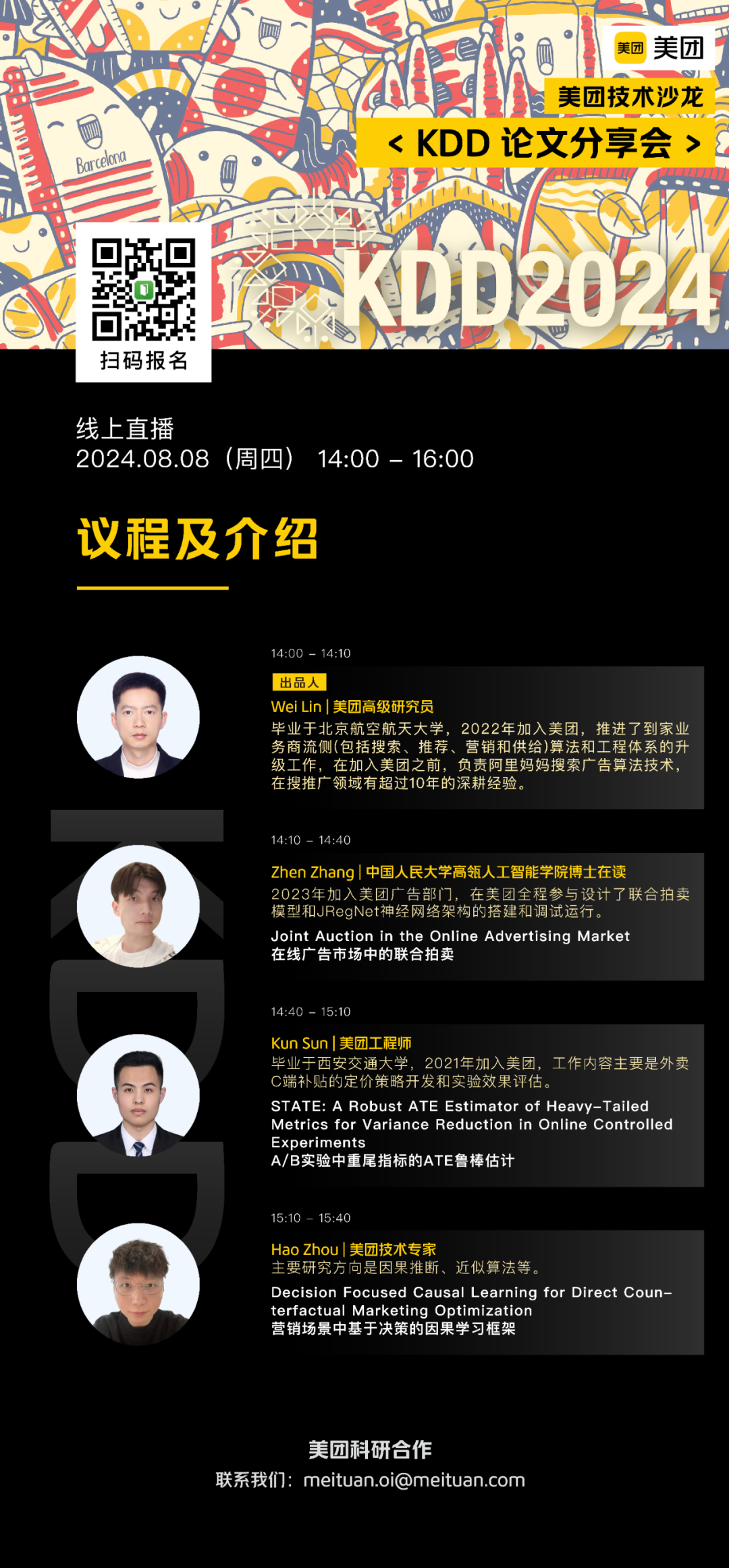 ACM SIGKDD (Knowledge Discovery and Data Mining,简称 KDD)是数据挖掘领域的国际顶级会议。KDD Cup比赛是由SIGKDD主办的数据挖掘研究领域的国际顶级赛事,从1997年开始,每年举办一次,是目前数据挖掘领域最有影响力的赛事。本文精选了美团技术团队被 KDD 2024 收录的 5 篇长文进行解读,覆盖了用户意图感知、机器学习&运筹优化、在线控制实验、联合广告模型、实时调度决策等多个技术领域。这些论文都是美团与高校、科研机构合作的成果。希望能给从事相关研究工作的同学带来一些帮助或启发。
