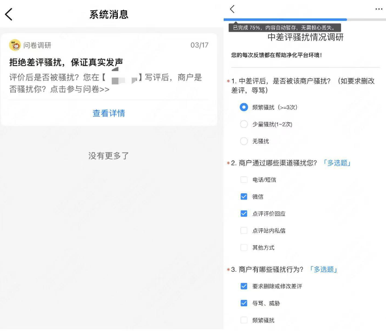 同时,我们也上线了“差评骚扰举报”功能,如大家因为写下差评被“花式骚扰”,可通过大众点评站内问卷反馈给我们,或是通过大众点评客服电话或者App举报入口反馈。