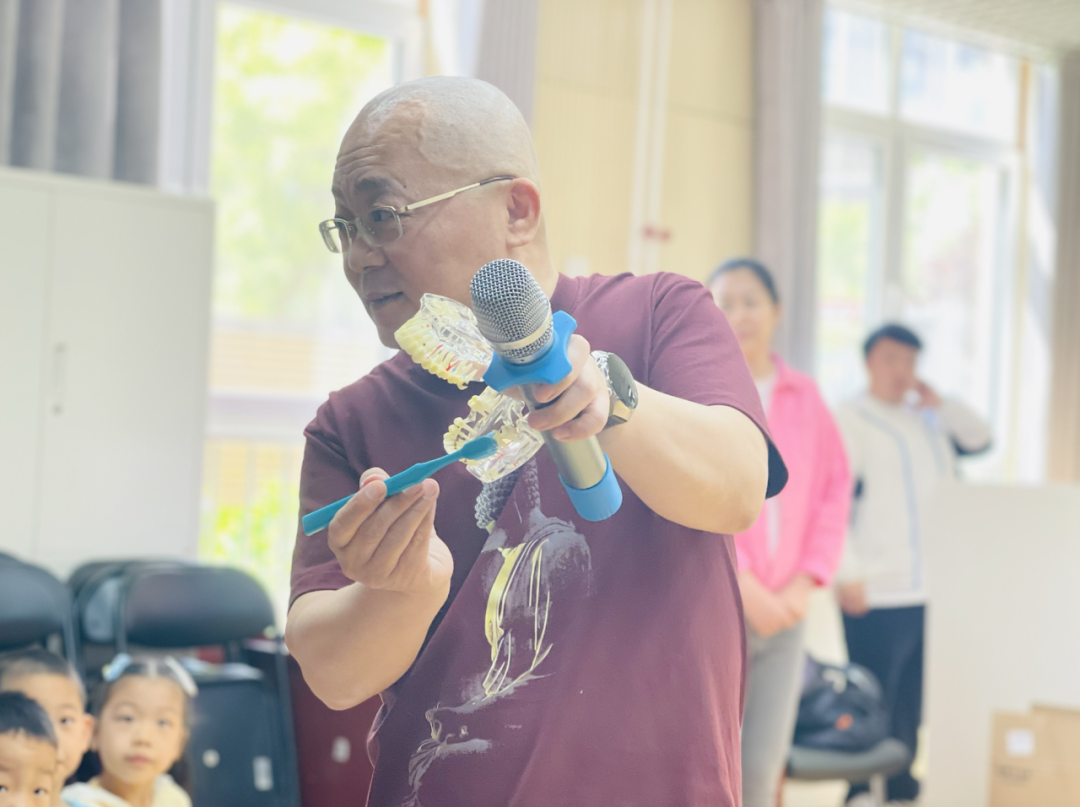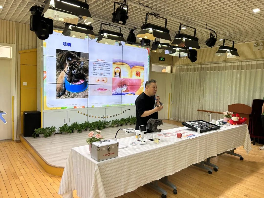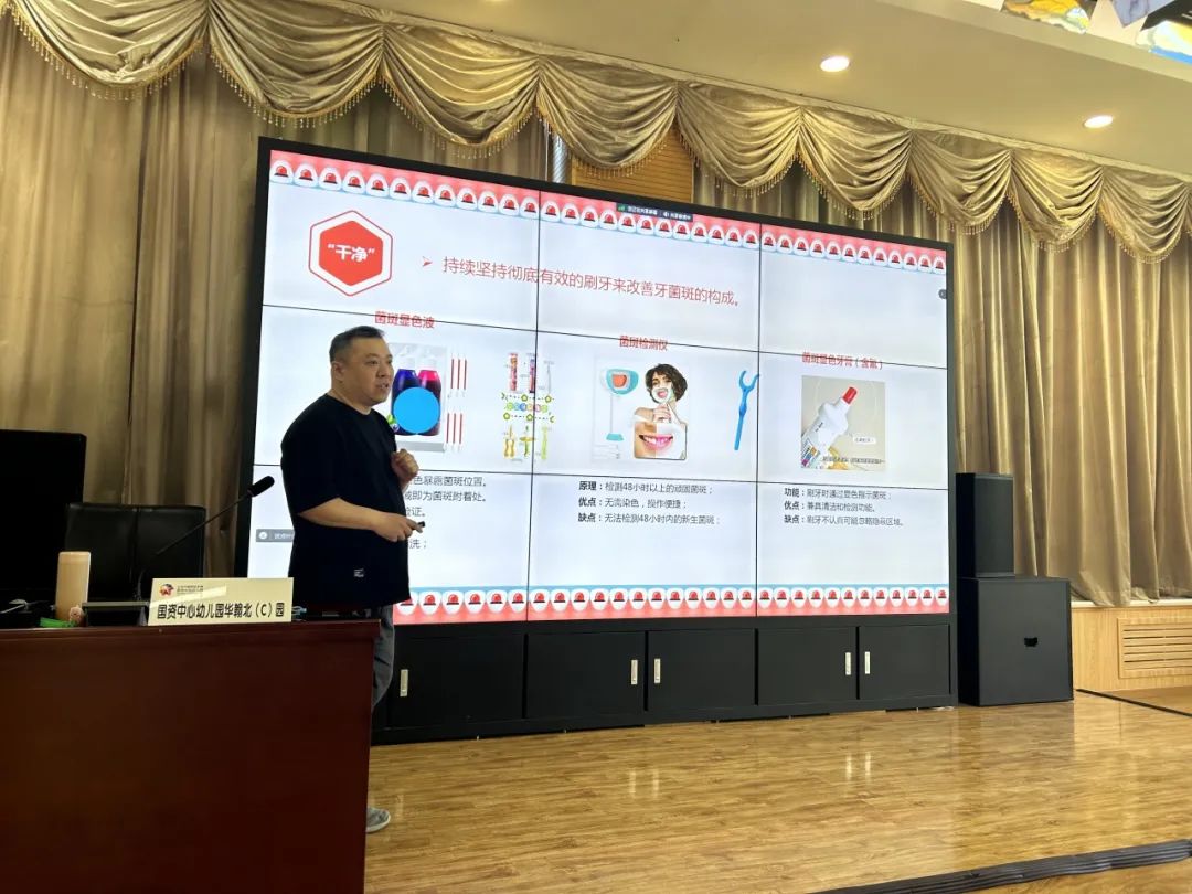 中国医药教育协会科普健康工作委员会委员王鹏老师首先为全体教职工分享了龋病预防与家庭菌斑控制的方法。他详细解读了“园校0龋行动”的核心内容与活动意义,即通过建立“有效刷牙预警雷达体系”,开展幼儿菌斑监测,并督促家长协助幼儿做好菌斑控制,从而显著降低园校新龋率。