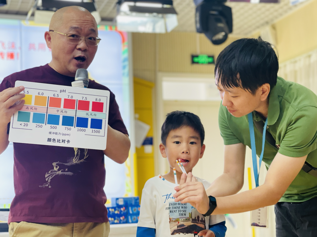 此外,王老师利用龋齿检测试纸,为五组家庭现场进行了患龋风险评估。这一环节不仅验证了致龋菌会在家庭内部传播,也提醒了家长们要注意日常卫生习惯,建议与幼儿分餐并积极治疗自身龋齿。最后,王老师巧妙地借助变脸卡片的展示,生动地向家长和小朋友们呈现了口腔健康对颜面部外观的重要影响,通过直观的视觉对比,使大家意识到维护良好口腔卫生、促进口腔健康的重要性。
