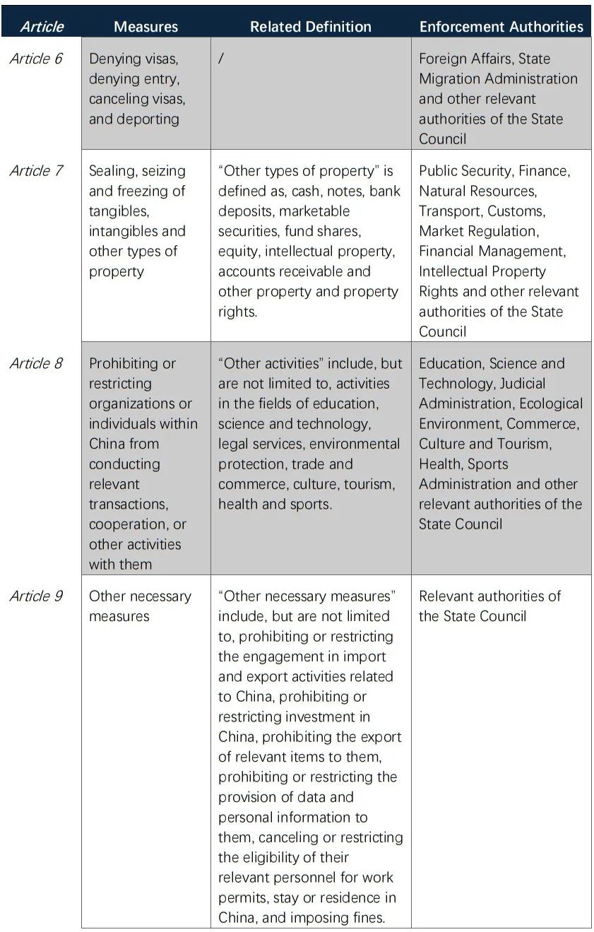 It is worth noting that, concerning the “other necessary measures” defined in Article 9 of the Regulations, in addition to those measures specifically provided in the Law on Countering Foreign Sanctions[3], the Regulations further incorporate other measures that have been put into use under other rules, such as the prohibitions and restrictions on import and export activities and investment in China under the Provisions on the Unreliable Entities List. Moreover, the Regulations, for the first time, adopt prohibition and restriction on the provision of data and personal information as one of the enforcement tools.