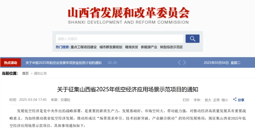 山西省发展和改革委员会发布关于征集山西省2025年低空经济应用场景示范项目的通知