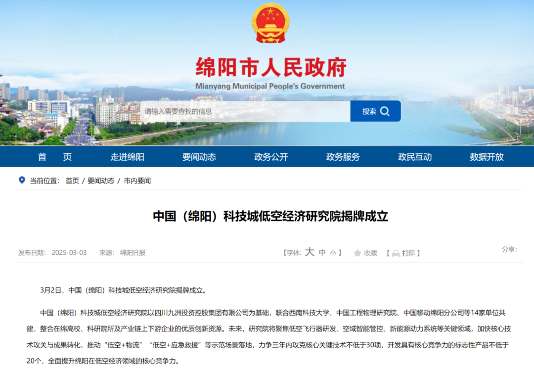 3月3日,中国(绵阳)科技城低空经济研究院揭牌成立。