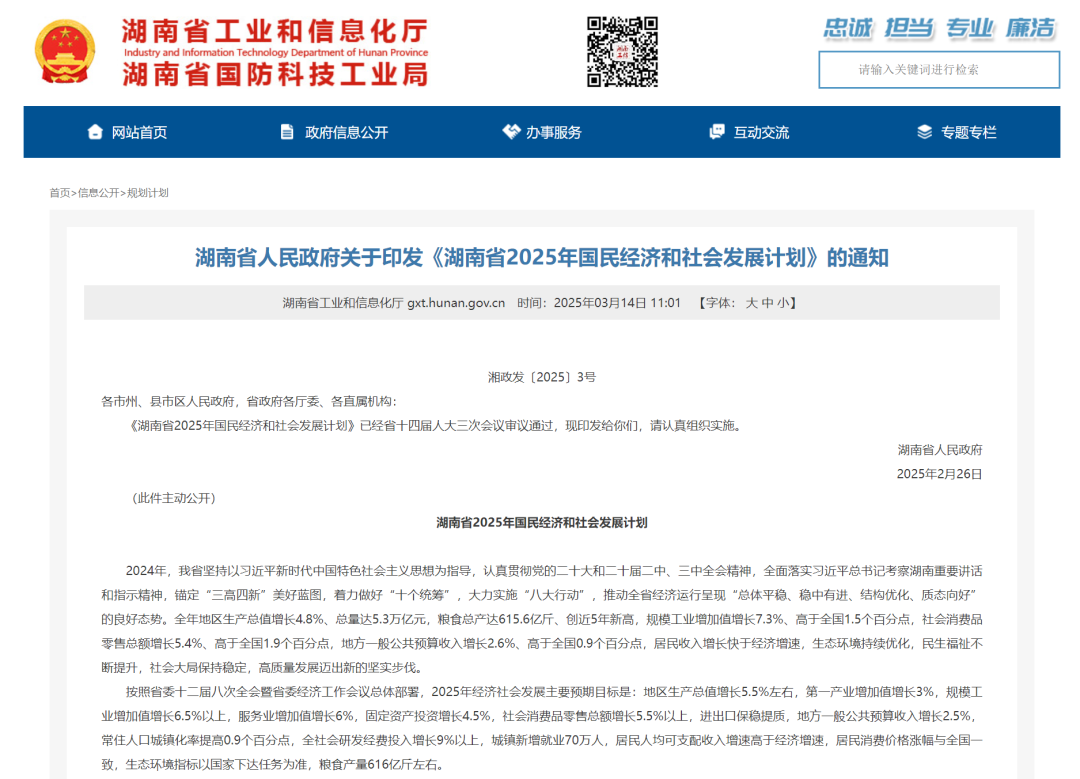 湖南省政府印发《湖南省2025年国民经济和社会发展计划》