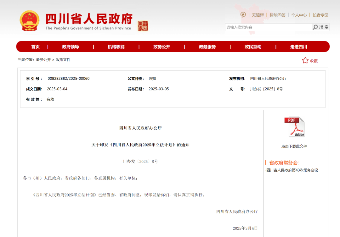 四川省政府办公厅印发《四川省人民政府2025年立法计划》
