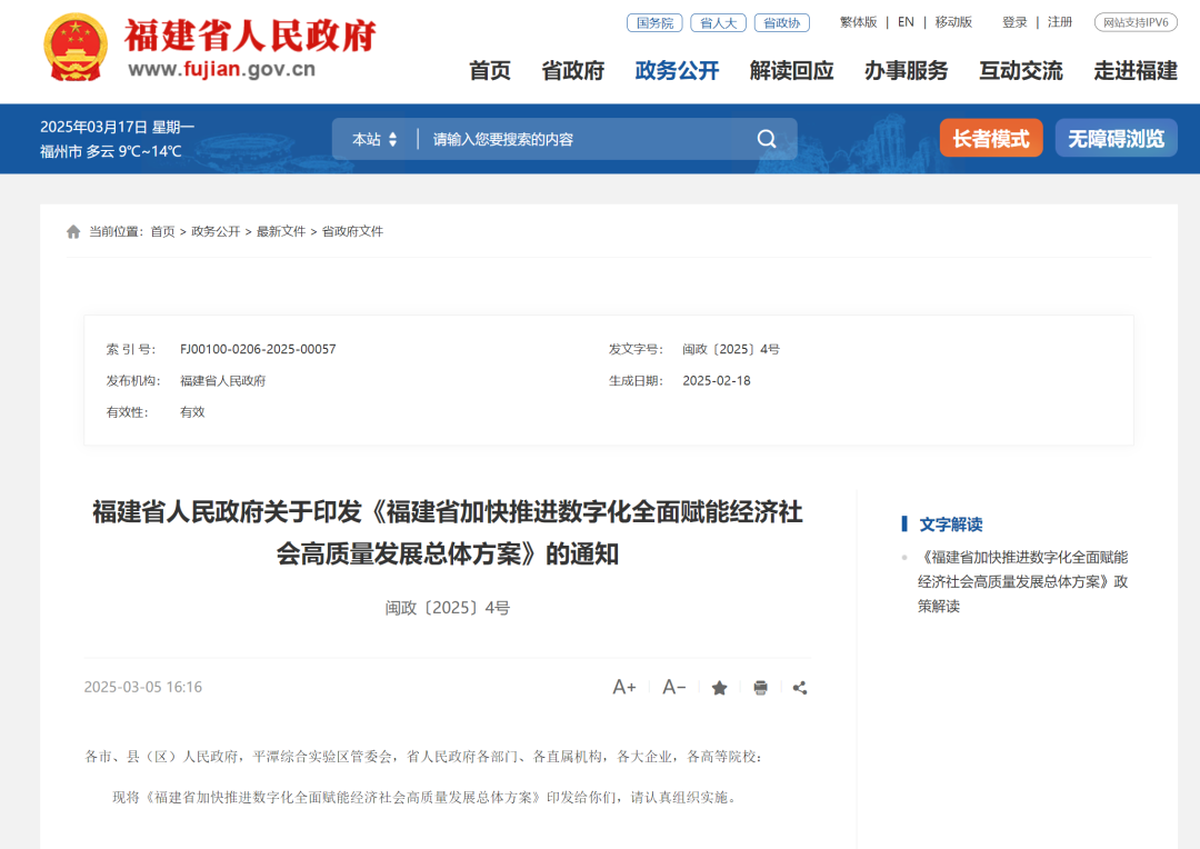 3月6日,福建省政府印发《福建省加快推进数字化全面赋能经济社会高质量发展总体方案》。