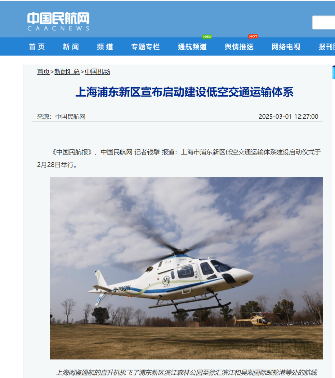 3月1日,《中国民航网》发布新闻:上海浦东新区宣布启动建设低空交通运输体系。