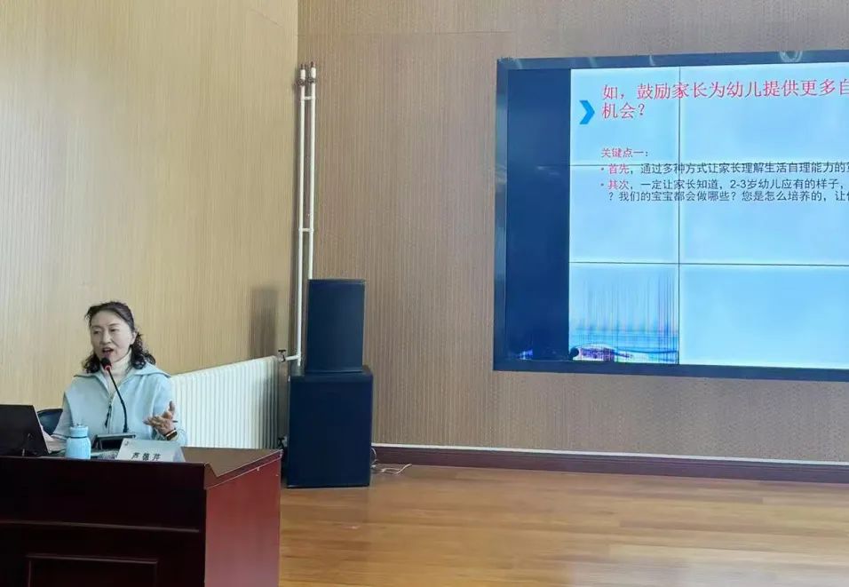 在活动最后,芦老师围绕托班幼儿自理能力的培养,分享了托班家长的工作方法。她指出,托班幼儿自理能力培养面临诸多挑战,包括幼儿生理发展尚未成熟、家长溺爱与过度保护、教师引导不足、教学智慧尚未形成、幼儿情绪抗拒与依赖心理较强、语言表达能力欠缺等因素。因此,在工作中要充分考虑托班幼儿的年龄特点。芦老师引导老师们反思了托班幼儿生活自理能力培养中的常见问题,并提出了托班教师在幼儿自理能力培养中可采取的措施,包括家园沟通、个性化指导、趣味培养、建立良好的自理习惯、情绪管理与支持、提升语言表达能力等。芦老师强调,通过家园协作的方式,才能更有效地共同培养托班幼儿的自理能力。