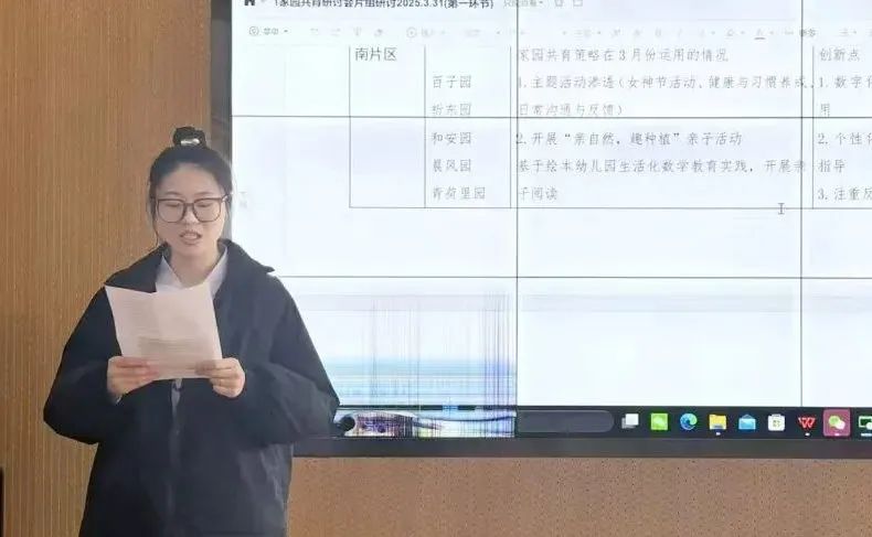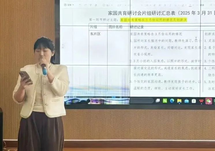 同时,芦老师对各小组的分享进行了专业点评,肯定了老师们结合本园和本班的实际,创造性地运用家园工作策略。此外,芦老师带领大家回顾了让家长信任的三个关键方法,并针对四月各园重点工作,如运动会、图书漂流、传染病防控、外出亲子社会实践、幼小衔接四项准备等,分享了“预防为主”的家长工作策略及具体方法。