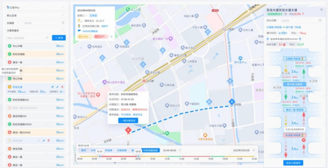 针对通勤专线、应急通道等,定制绿波控制方案并持续优化。输入线路起止点与优先方向,调用模型计算理想车速(如 50km/h),制定路口配时方案。