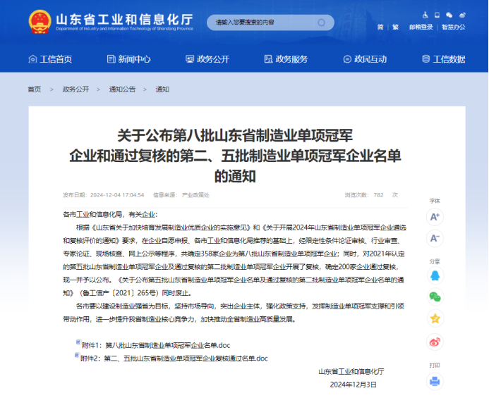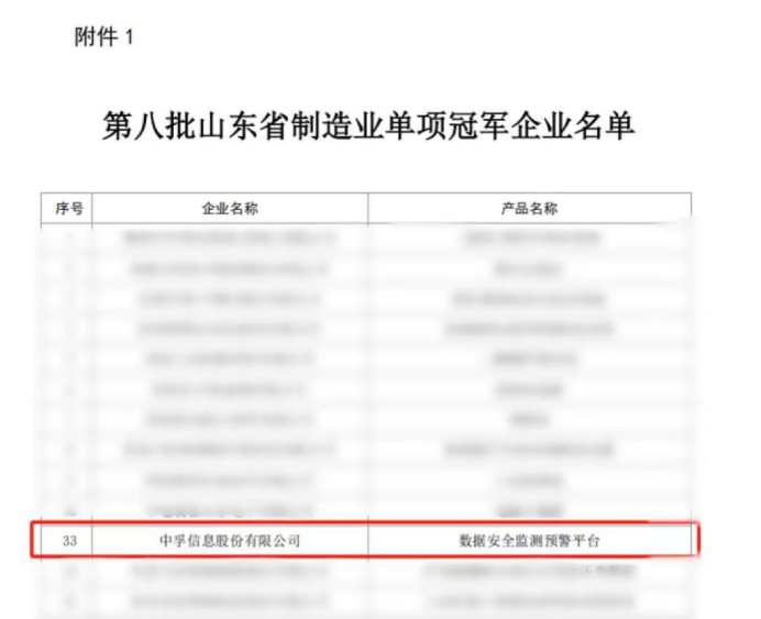 2024年12月4日,山东省工业和信息化厅公布第八批山东省制造业单项冠军企业名单,经限定性条件论证审核、行业审查、专家论证、现场核查、网上公示等程序,中孚信息股份有限公司凭借自主研发的“数据安全监测预警平台”在同行业内的领先优势,荣获山东省制造业单项冠军企业称号。