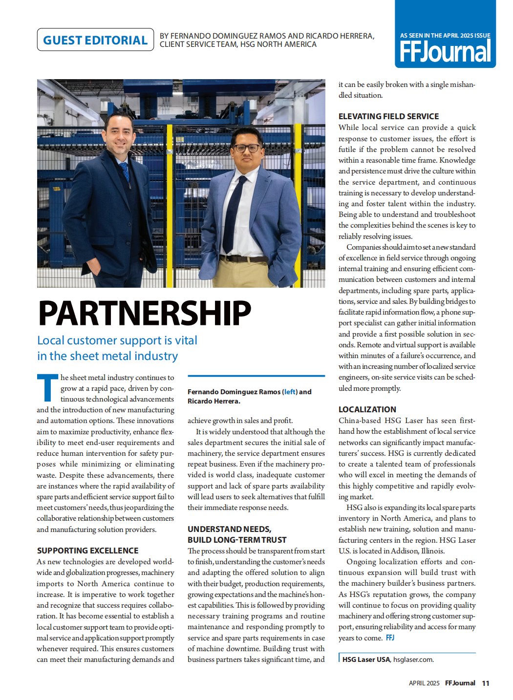 近日,宏山激光HSG Laser凭借在北美市场持续深化的本地化服务实践,荣登北美金属加工权威杂志《FFJournal》2025年4月刊。本期杂志特别刊载了由HSG北美区域团队成员Fernando与Ricardo联合撰写的专题文章,聚焦“合作伙伴关系”主题,系统阐述了本地化售后服务和备件保障对于制造企业运营效率与客户信任构建的重要价值。