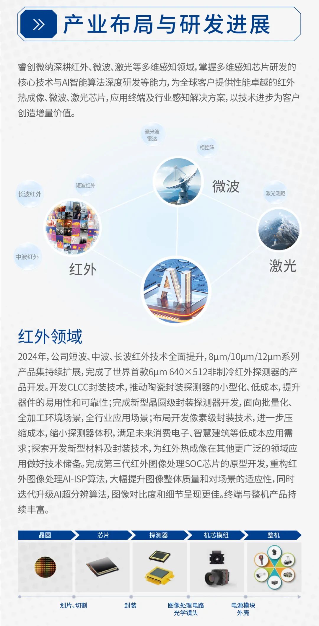 睿创微纳(股票代码:688002)是全球领先的、专业从事专用集成电路、感知芯片与AI智能整机产品与解决方案研发的国家级高新技术企业。公司深耕红外、微波、激光等多维感知领域,掌握多光谱感知芯片研发的核心技术与AI智能算法深度研发等能力,为全球客户提供性能卓越的红外热成像、微波、激光芯片,应用终端及行业感知解决方案,以技术进步为客户创造增量价值。