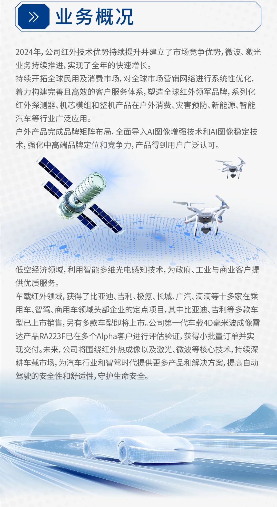 睿创微纳产品广泛应用于航空航天、卫星通讯、空间通讯、碳中和、低空经济、安防消防、智能驾驶、应急救援、消费电子、人工智能、医疗健康、科研创新等领域。