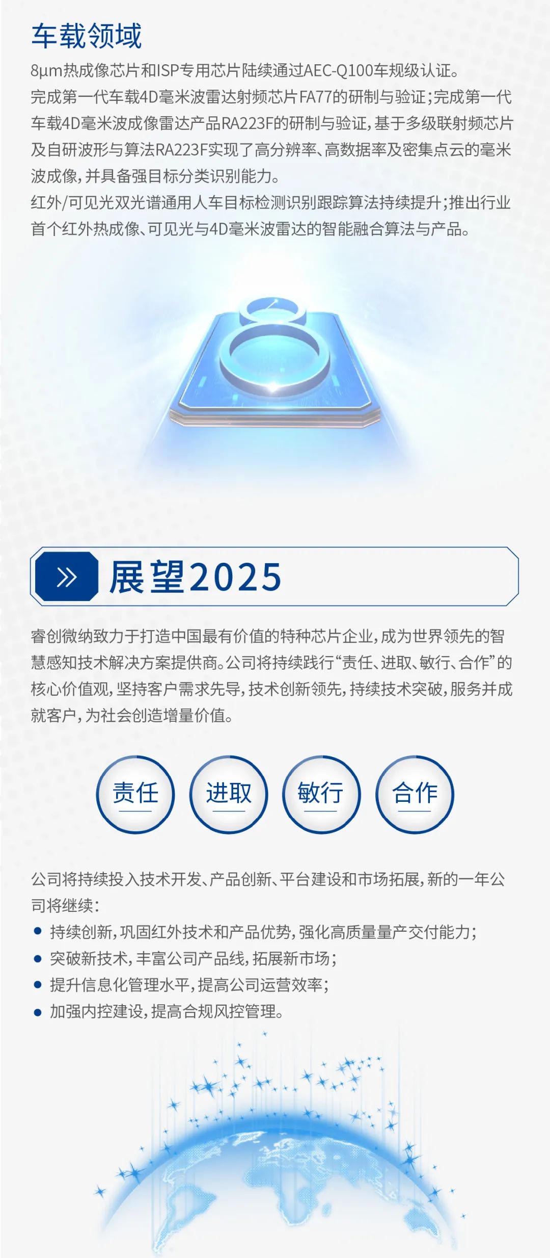 睿创微纳致力于打造中国最有价值的特种芯片企业,成为世界领先的智慧感知技术解决方案提供商,承载“让人们从更多维度发现世界之美”的使命,在持续拓展人类感知能力的征途上留下自己的脚印。
