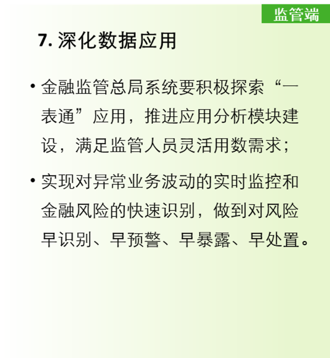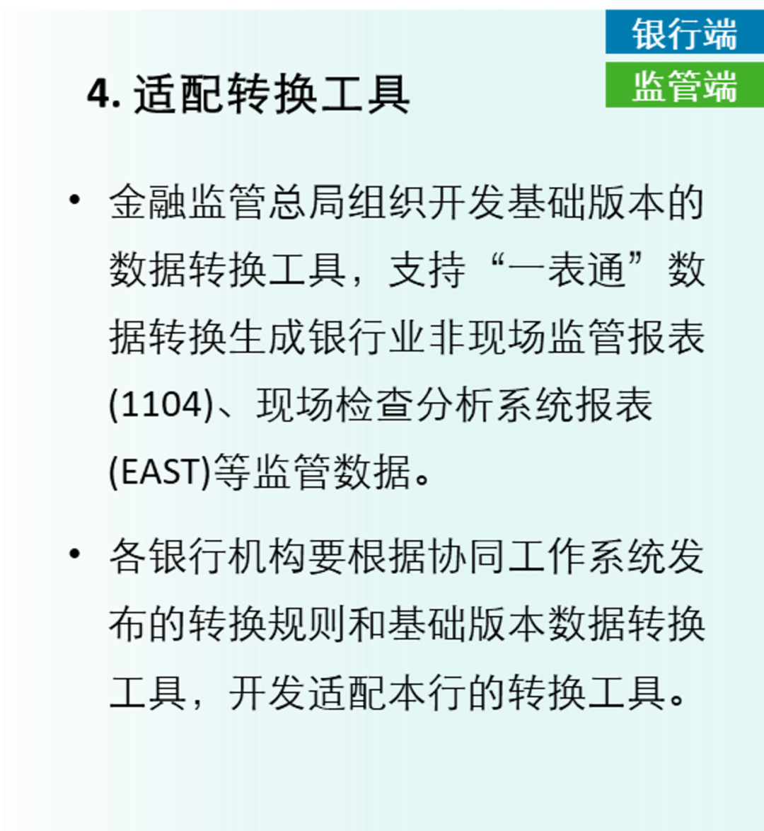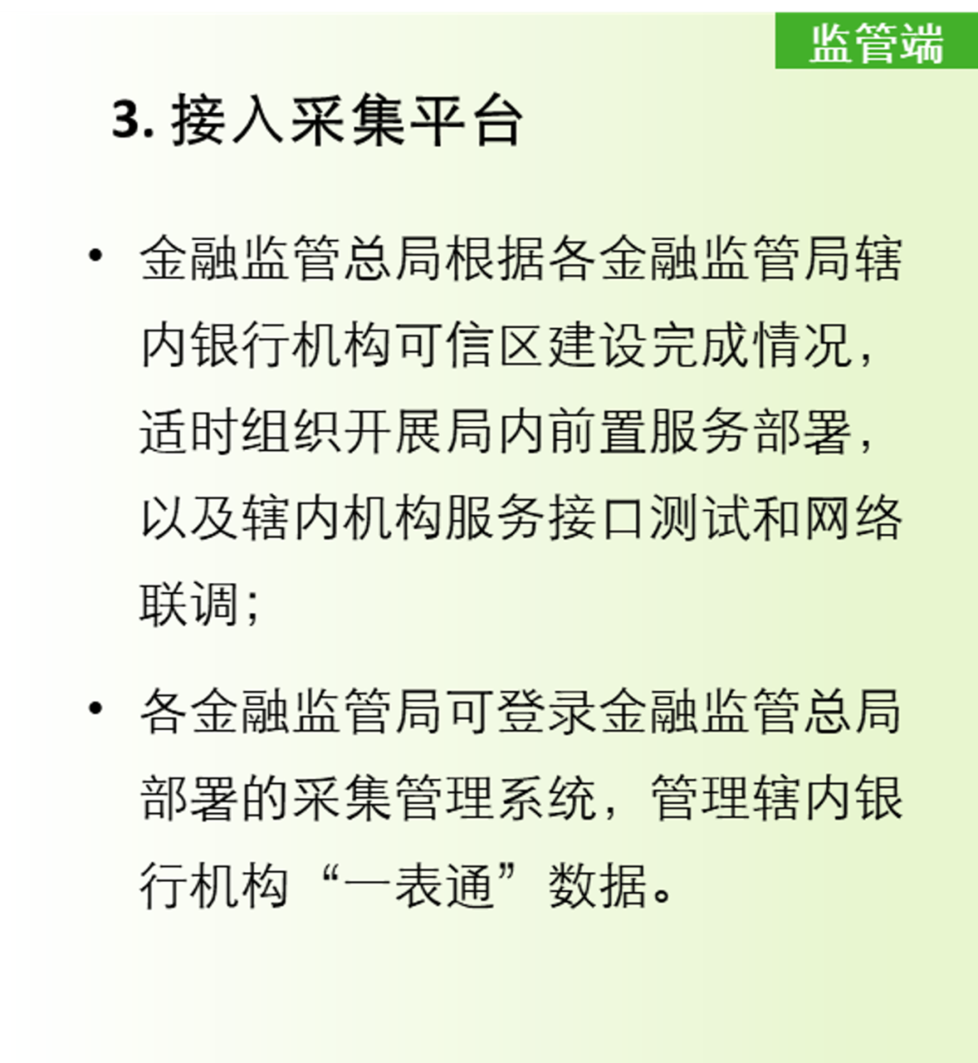 同时也对各监管局和银行机构提出了高度重视“一表通”建设,深刻认识“一表通”工作的重要意义,准确把握和认真组织落实各项工作任务等要求,具体包括“做好数据报送准备、建立监管可信区、推进数据源统一”三项对银行机构的要求、“适配转换工具、完善管理制度”两项对监管端和银行机构共同的要求以及“接入采集平台、深化数据应用”两项对监管端的要求。