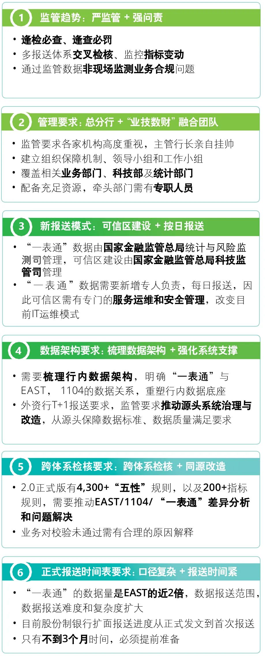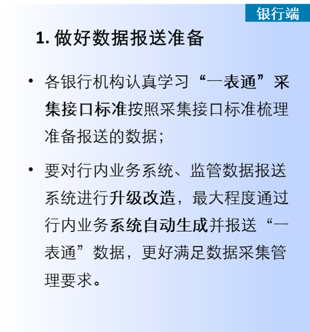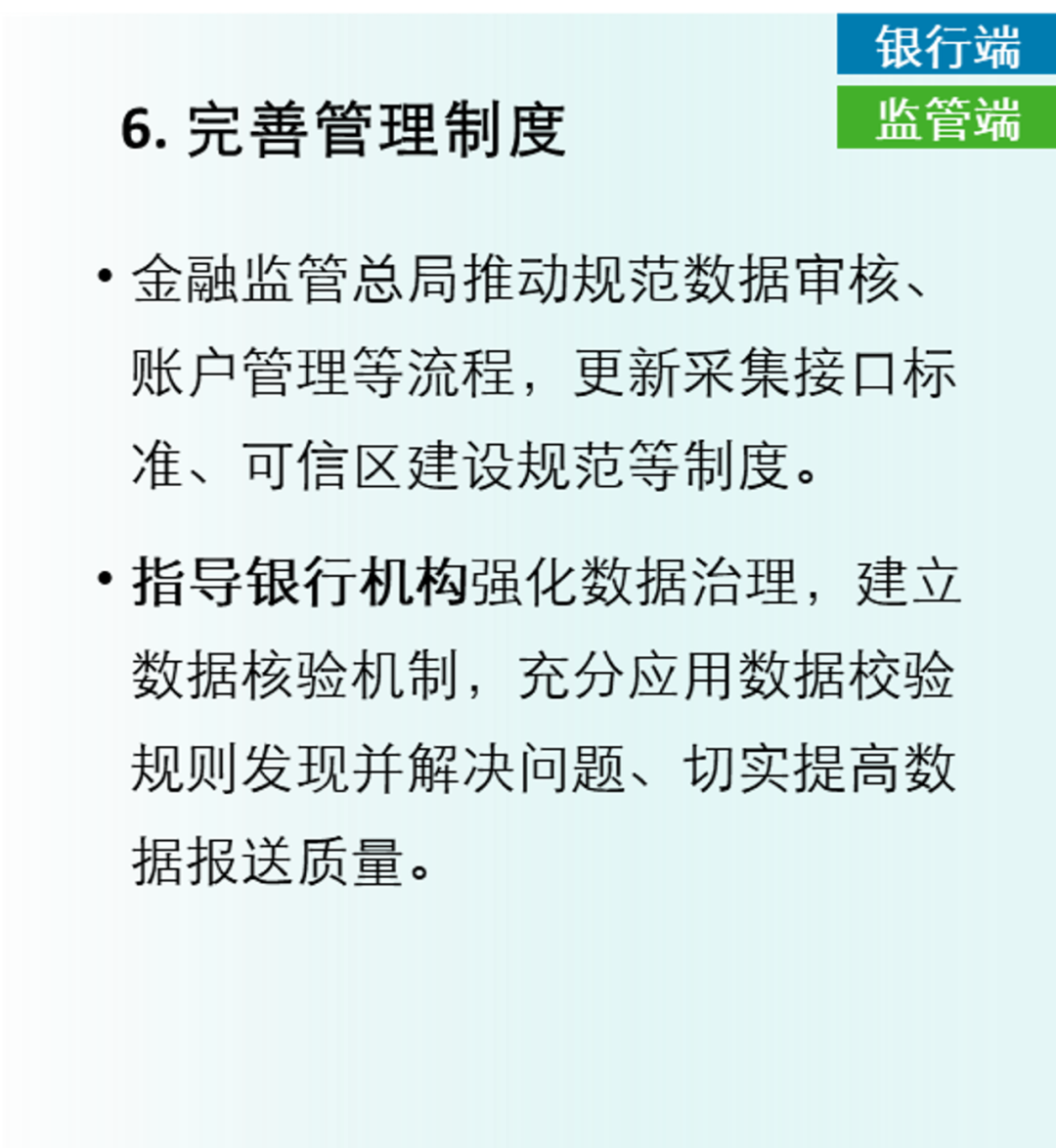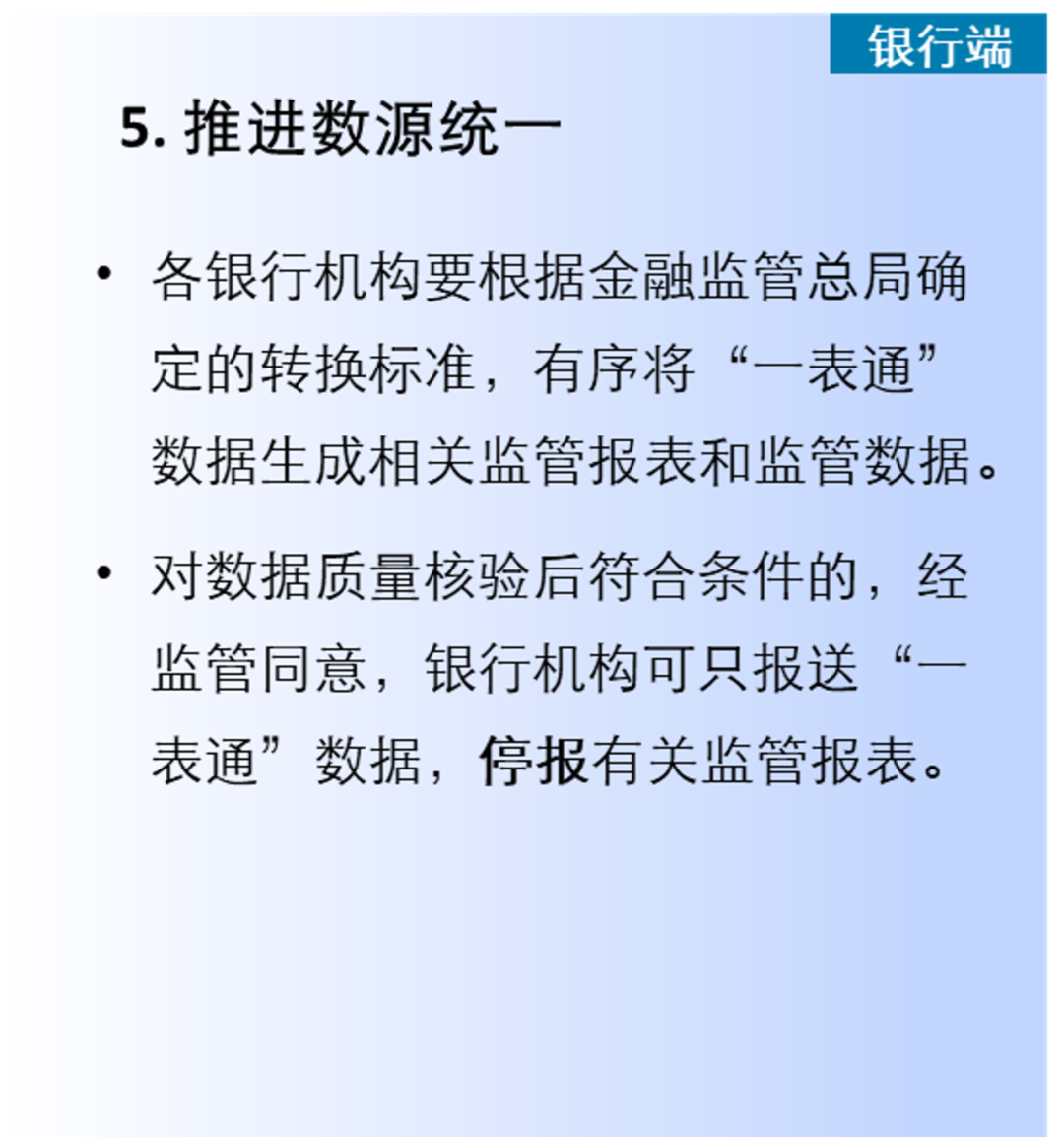 同时也对各监管局和银行机构提出了高度重视“一表通”建设,深刻认识“一表通”工作的重要意义,准确把握和认真组织落实各项工作任务等要求,具体包括“做好数据报送准备、建立监管可信区、推进数据源统一”三项对银行机构的要求、“适配转换工具、完善管理制度”两项对监管端和银行机构共同的要求以及“接入采集平台、深化数据应用”两项对监管端的要求。