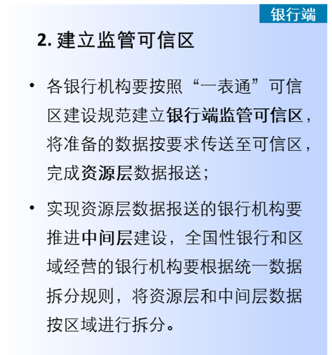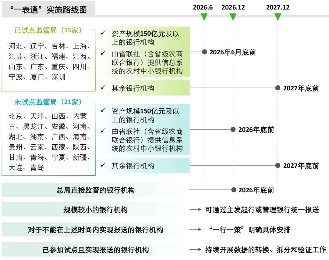 各银行机构的“一表通”数据报送则根据是否为已试点地区以及银行机构的资产规模情况,分2026年6月、2026年底和2027年底等里程碑分批次推进,2027年底前实现全银行业金融机构的报送,当前已参加试点且实现报送的银行要持续开展数据的转换、拆分和验证工作。