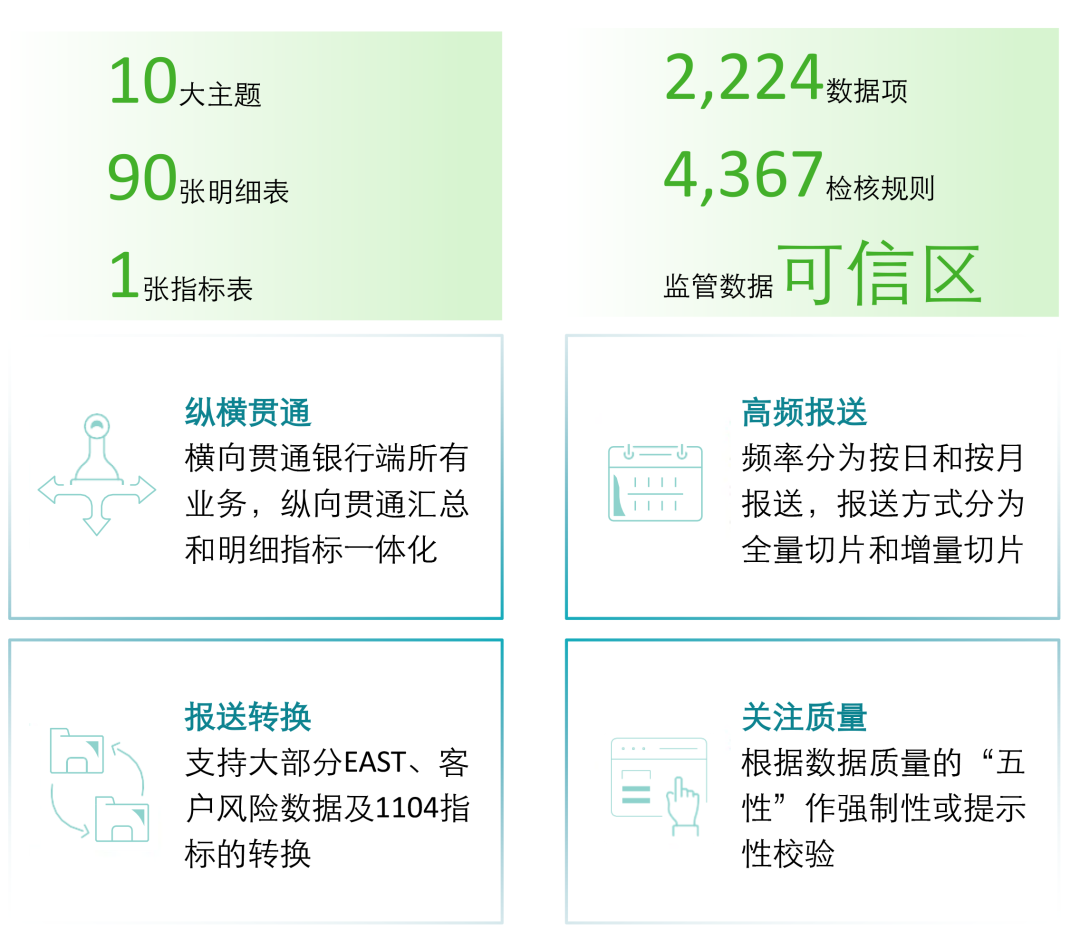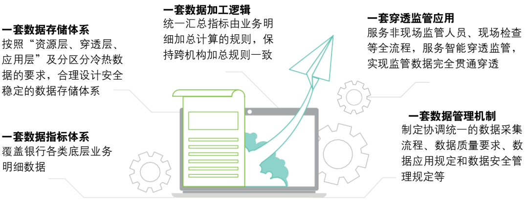 “通”指“贯通”与“联通”:“贯通”包括横向贯通(覆盖银行端所有业务)和纵向贯通(汇总指标和明细指标一体化设计);“联通”指监管端主要监管数据系统的联通。