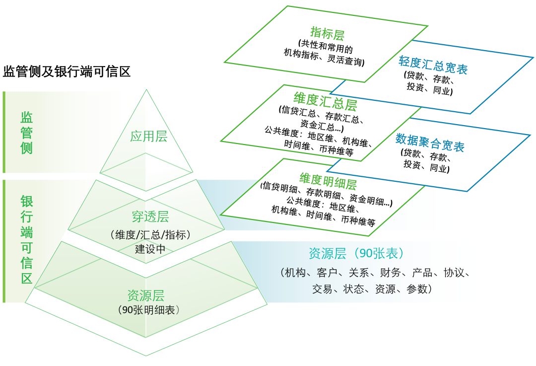银行端可信区包含资源层和穿透层两层建设任务:资源层为按数据采集接口标准从银行采集的涵盖90张报表的明细数据;穿透层基于资源层数据,遵循统一灵活、适度前瞻、适当冗余、共享复用的原则,包含维度明细层、数据聚合宽表和指标层。