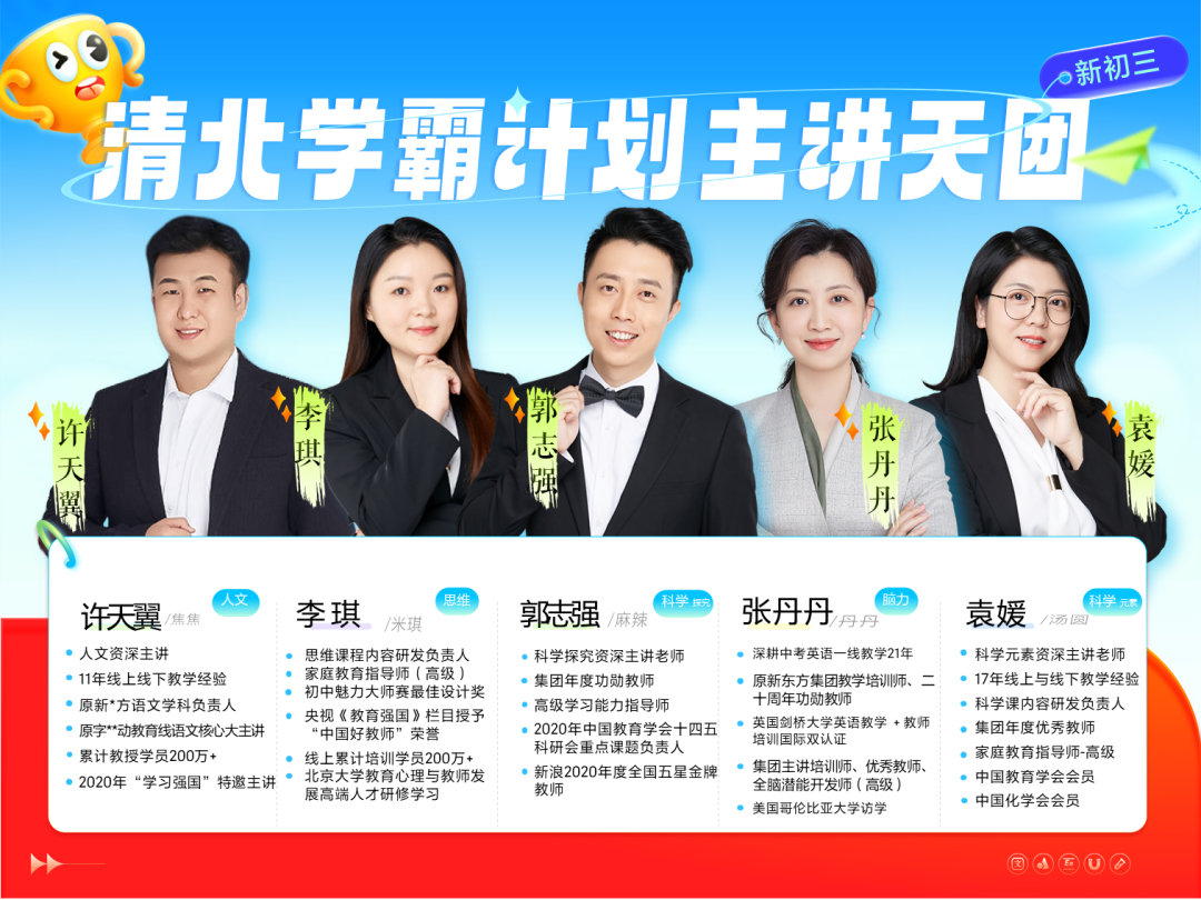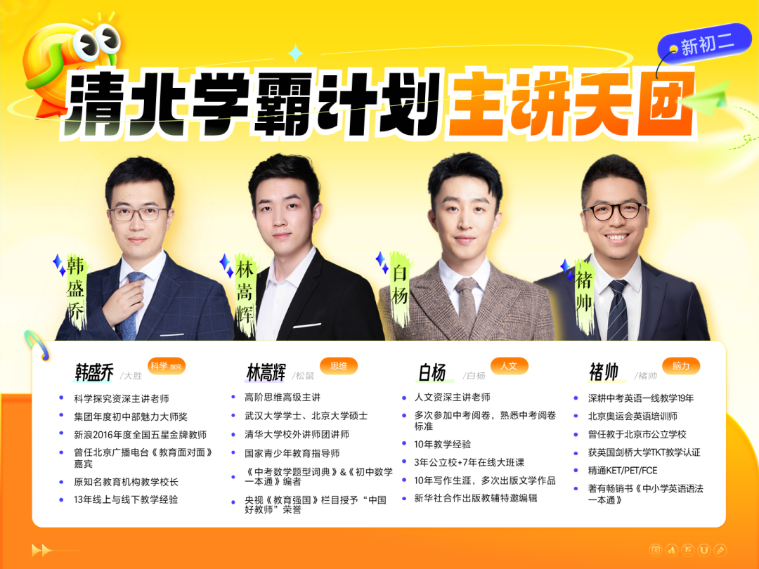 高途采用独家创立的7+6高效学习法,从课上到课下,为孩子的学习保驾护航!为了帮助每个孩子能够学有所得,本次特训营配备了高途优秀讲师+一名专属指导老师。他们功底深厚,经验丰富,家长和孩子可以随时提问!现在报名学习,相当于您直接不花钱!帮孩子请一位专业私教!高途资深主讲老师,设计 导-讲-学-复-测 五大闭环的课程体系。从孩子实际学习难点出发,真正做到从孩子的理解能力出发。10套初中9科知识精华