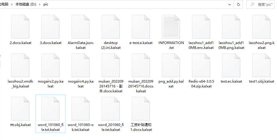 受害者反馈显示,攻击者会在加密后将文件扩展名统一修改为".kalxat",并植入勒索信息索要赎金。