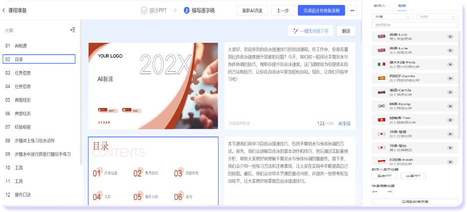 (2)AI设计内容:全自动产课,数字人授课