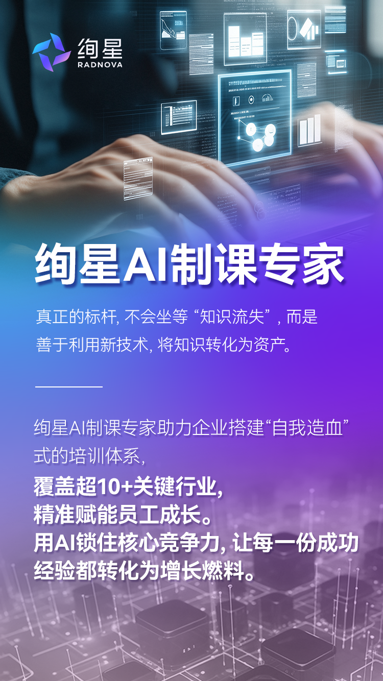 绚星AI制课专家通过大量探索和实践,集合了课程开发、经验萃取、教育目标分类、教学设计等经典原理,形成了一套有效方法,旨在助力员工人人为师,重塑企业知识生产,传承组织智慧。
