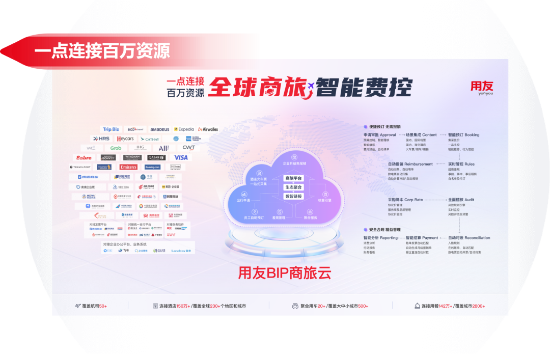除了对现有供应商的管理与优化,用友商旅云积极拓展新的供应商合作,不断引入更多的全球优质资源,丰富企业商旅的选择范围。通过与全球各大航空公司、酒店集团、用车服务商等的深度合作,为企业打造一个覆盖企业因公消费全场景、多层次的商旅服务生态,让每一位员工都能享受到优质的服务体验。