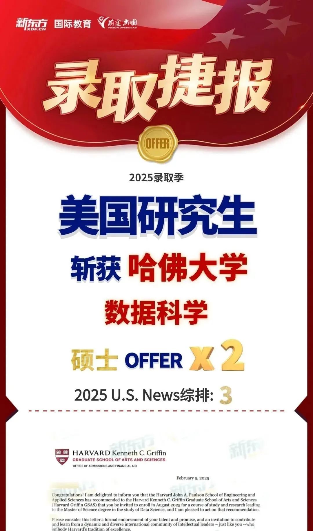 截至5月15日,新东方前途出国在2025年录取季中共斩获U.S.News TOP50院校Offer共9655枚!并且实现“哈耶普斯麻”大满贯!