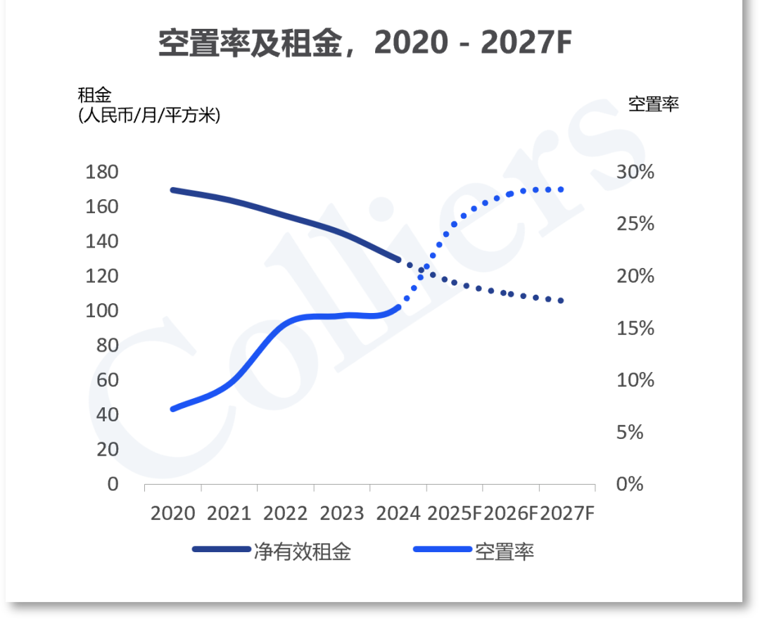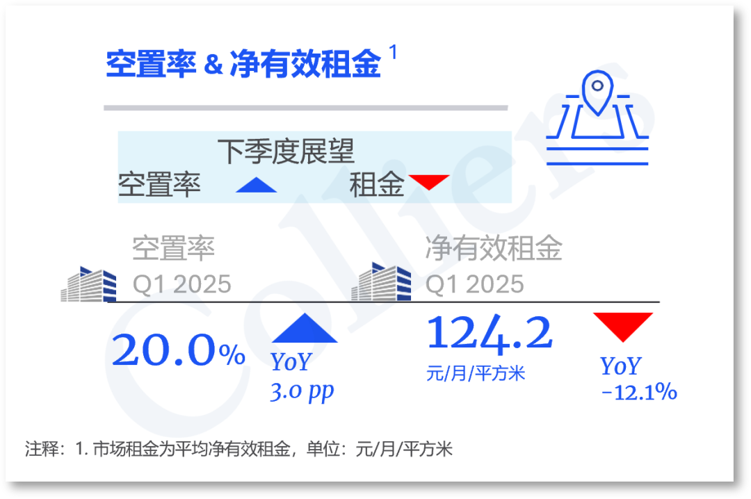 截至2025年一季度末,全市甲级写字楼净有效租金录得124.2元每月每平方米,环比下降3.6%,同比下降12.1%,租金降幅较去年四季度基本保持一致。