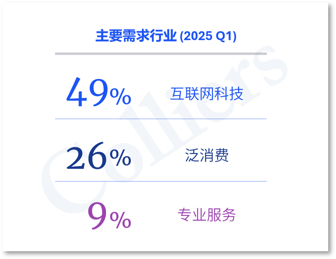 一季度,互联网科技类企业成为租赁需求的主要来源,租赁面积占比近50%。