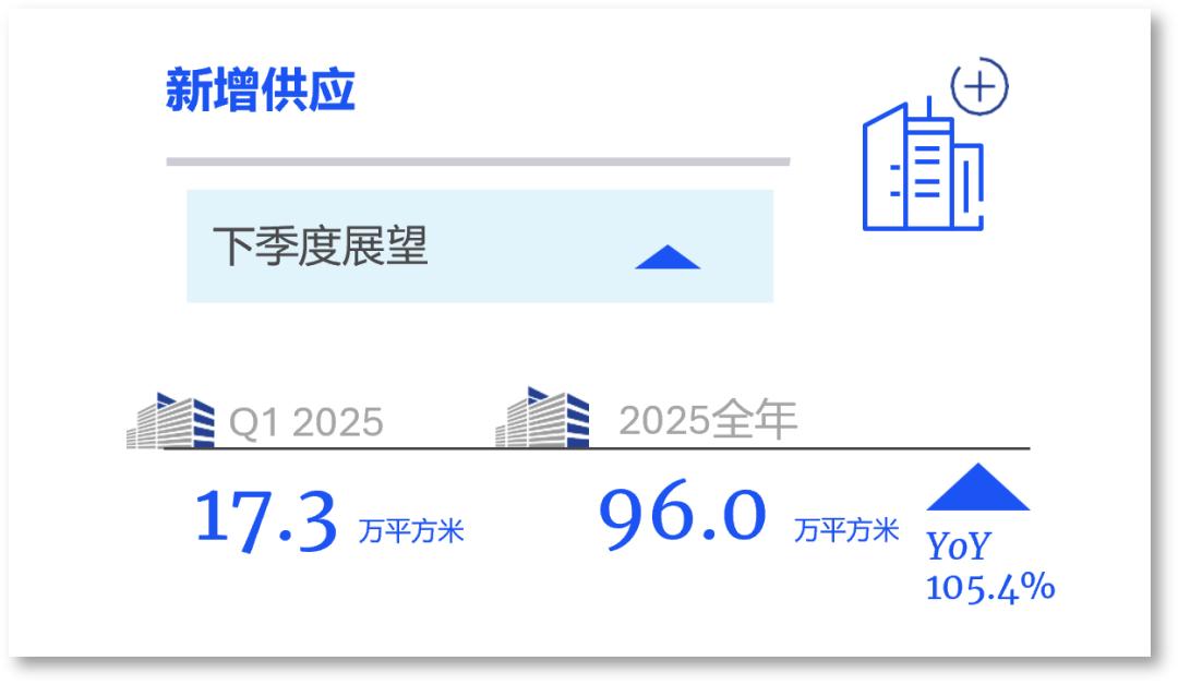 在当前市场经济预期趋向疲弱的背景下,企业对租赁动作表现较为谨慎,观望情绪相对浓厚,季内广州甲级写字楼增量需求不及去年同期水平。一季度,金融方城全面封顶,广州国际金融城迎来关键节点,为产业集聚“筑巢引凤”。2025年,广州甲级写字楼市场供应预计约100万平方米,在当前增量需求增长相对放缓的背景下,预计2025年写字楼空置率将继续上升约3.0-5.0个百分点。持续上升的空置率以及平静的市场需求暂时无法支撑租金企稳,预计2025年广州甲级写字楼租金继续承压。