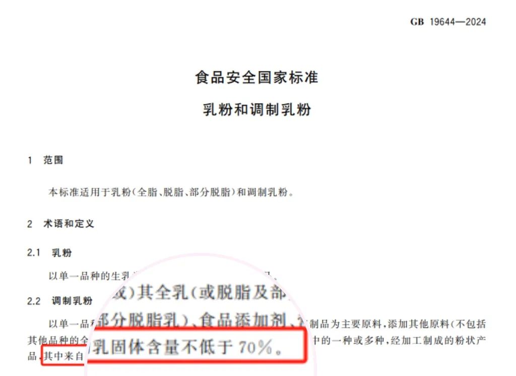 按照新国标GB19644-2024《食品安全国家标准乳粉和调制乳粉》,主要原料的乳固体含量不低于70%,驼乳粉也遵循这个原则。