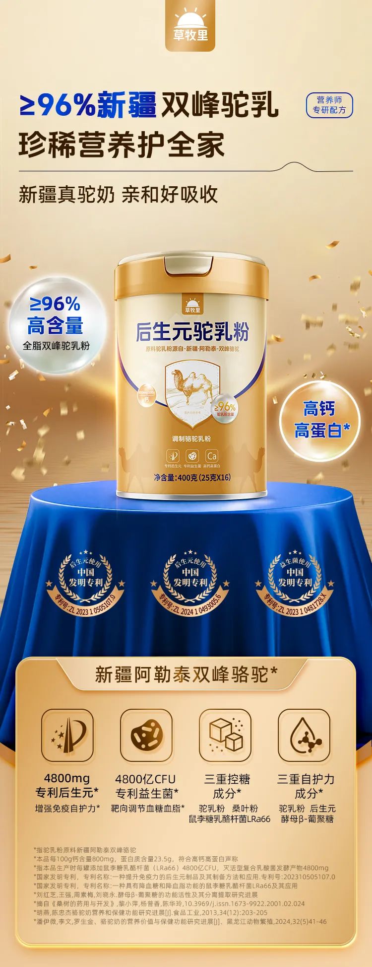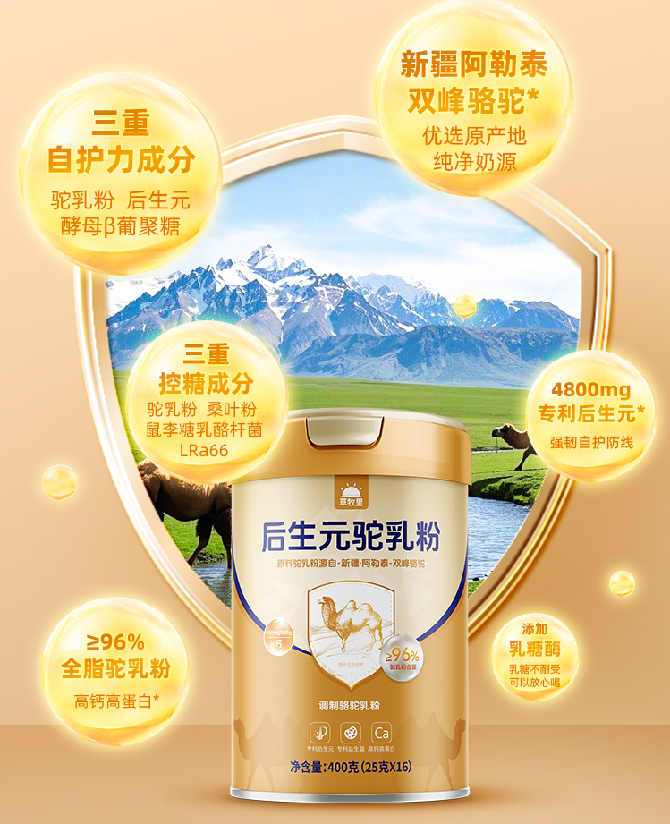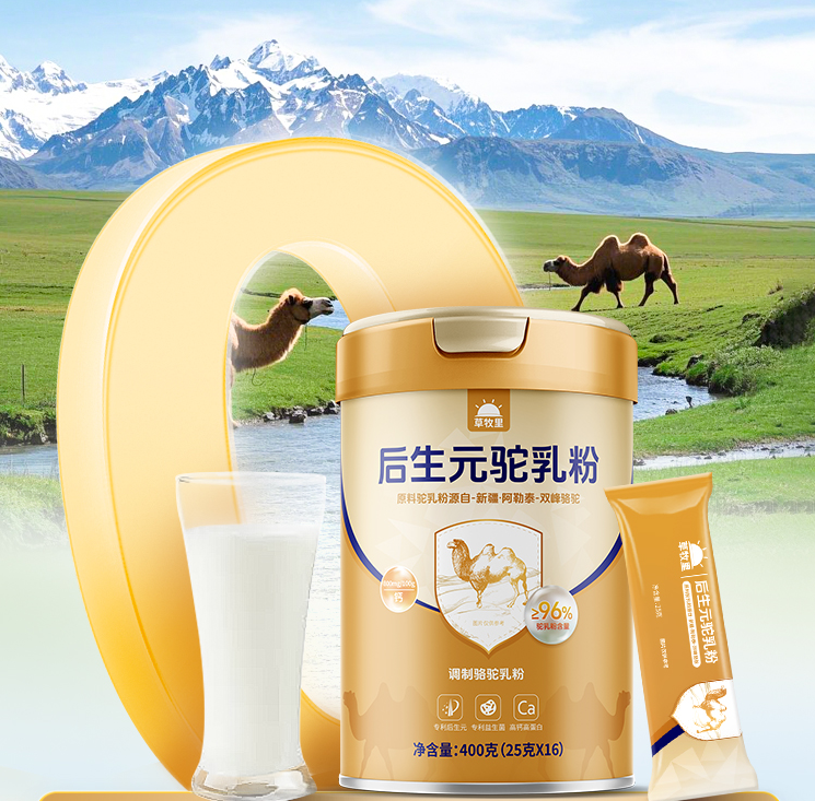 草牧里后生元驼乳粉,用新疆阿勒泰的天然馈赠,搭配现代专利技术,每天一杯驼奶,把“液体黄金”的营养喝进肚里!