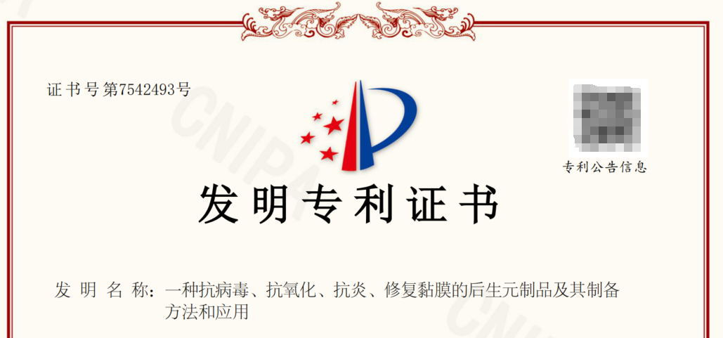 添加4800mg专利后生元,同时获得了“一种提升免疫力的后生元制品及其制备方法和应用”和“一种抗病毒、抗氧化、抗炎、修复黏膜的后生元制品及其制备方法和应用”2项专利,帮助增强免疫自护力。