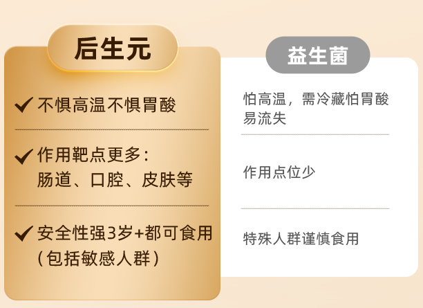 后生元耐高温胃酸,可直达肠道调节菌群,让肠道年轻有活力,消化吸收更顺畅。