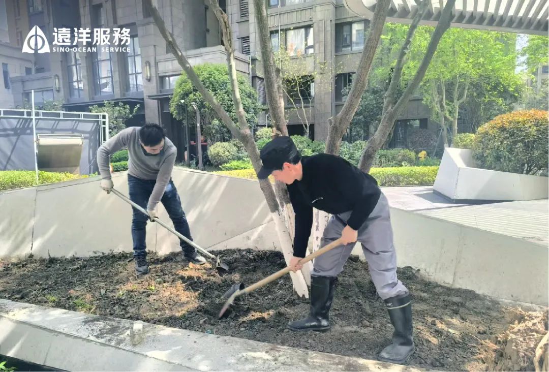 绿化需要常换常新,小区裸土、植物活力不足的区域,远洋服务进行植物焕新,恢复景观活力。
